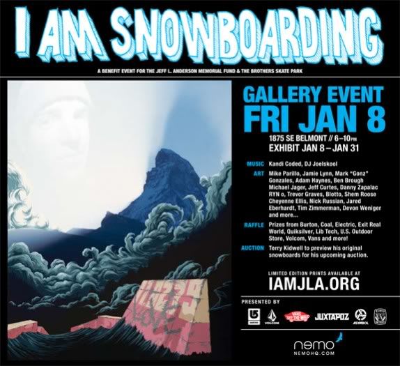 One of the most original events in snowboarding and art is coming to Portland. I AM SNOWBOARDING, a collaborative art project in honor of Jeff Anderson, opens at the NEMO gallery (1875 SE Belmont), on Friday, January 8. The opening party is slated from 6-10pm and will feature collaborative art from snowboard photographers and artists, music from Kandi Coded and DJ Joelskool, raffles from the sponsors (Volcom, Vans, Lib Tech, etc.) and if that wasn't enough, Terry Kidwell will be on hand showing off some of his original snowboards soon to be put up for auction.