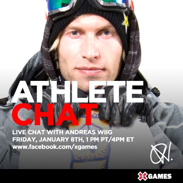 This Friday January 8 at 1pm Pacific-4pm Eastern, Andreas Wiig will be chatting live on facebook. Fans who participate will have a chance to win gift bags from Andreas' sponsors including: Forum, Rockstar, Vans, Electric, Matix, Toyota, Keystone and more.